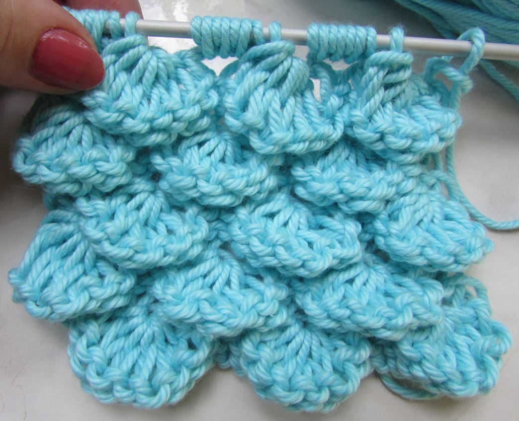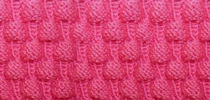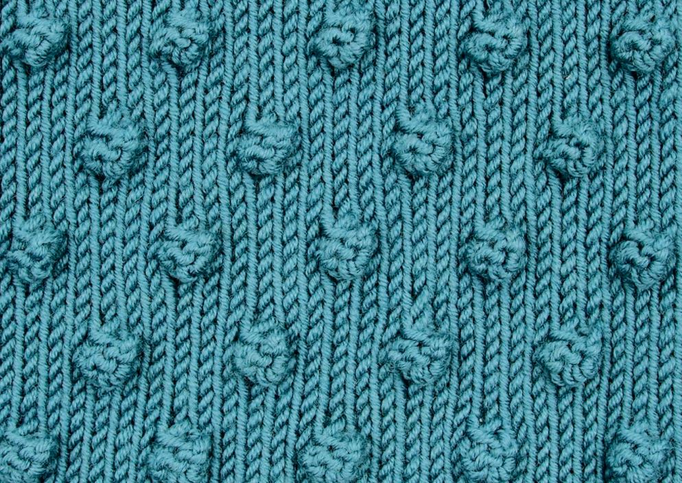 Отдельные шишечки, размещенные по лицевой глади, смотрятся аккуратно и стильно. Таким узором можно связать пуловеры, жакеты, снуды.
