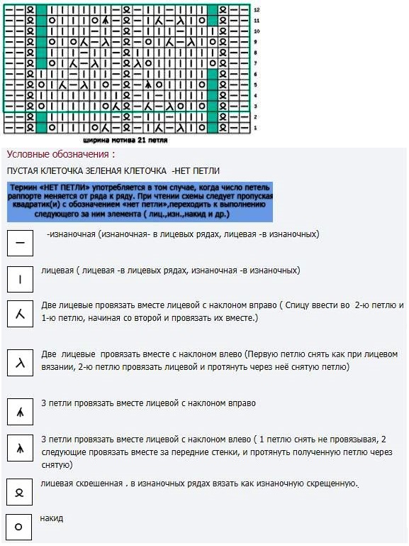 По ширине Р = 21п. По высоте узор листья спицами однократно вяжите с 1р. по 12р., далее повторяем с 3р. по 12р.