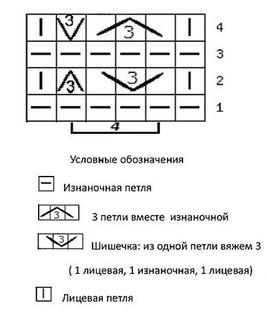 - 4р.: 1кр., *7п. в 1 изн., из 1п. вывязываем 7п.* – от * и до * повторяем до конца, 1 кр.;