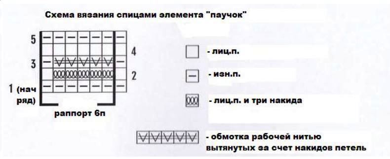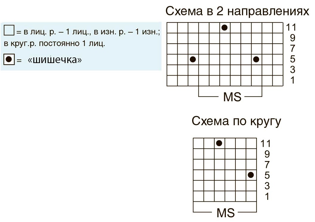Для вязания спицами узора используем описание и схемы. Шишечки можно вывязывать как на прямом полотне, так и при вязке вкруговую.