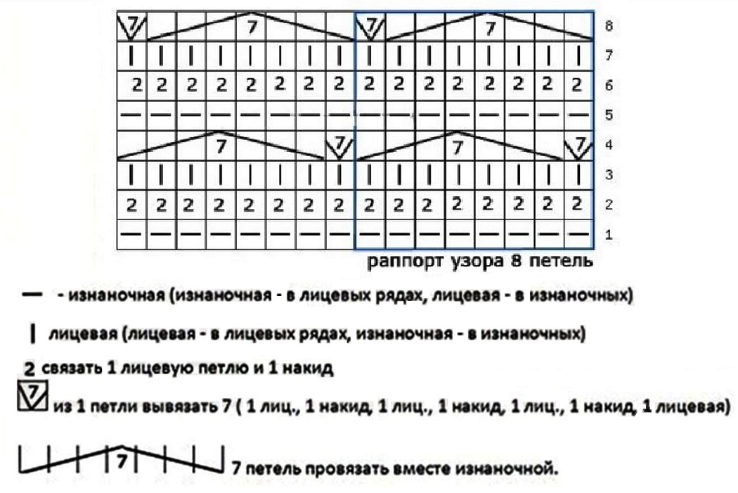 Схема вязания спицами узора представлена ниже. На ней присутствуют только ЛР, в ИР этот фантазийный узор вяжем по рисунку. Накиды при этом провязываем изнаночными.
