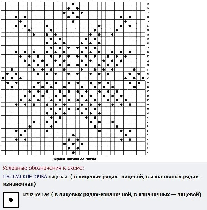 Схема вязки простая, но она содержит много элементов. Важно не нарушить структуру узорчика в процессе вывязывания.