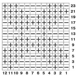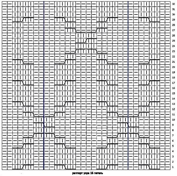 Ширина узора – 20п., по высоте однократно вяжем с 1р. по 16р., далее повторяем с 5р. по 16р.