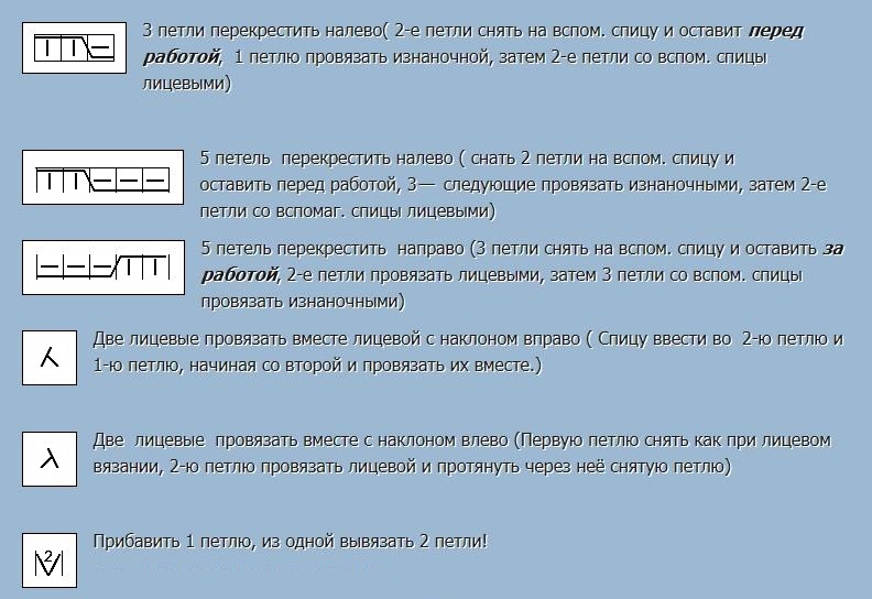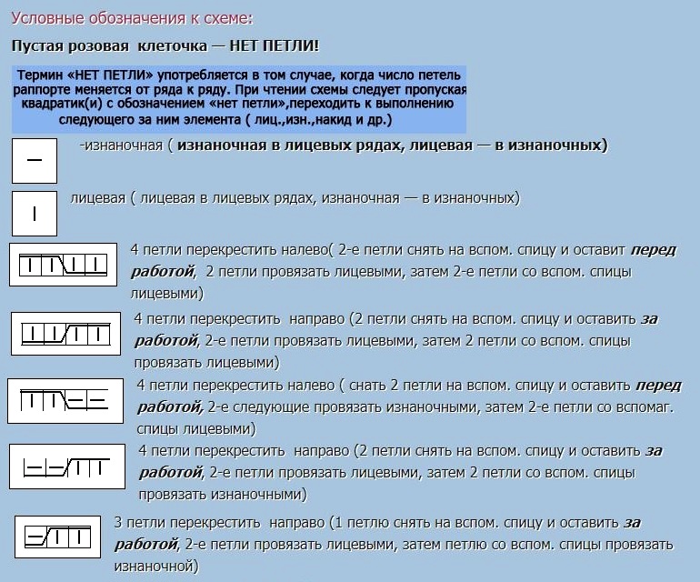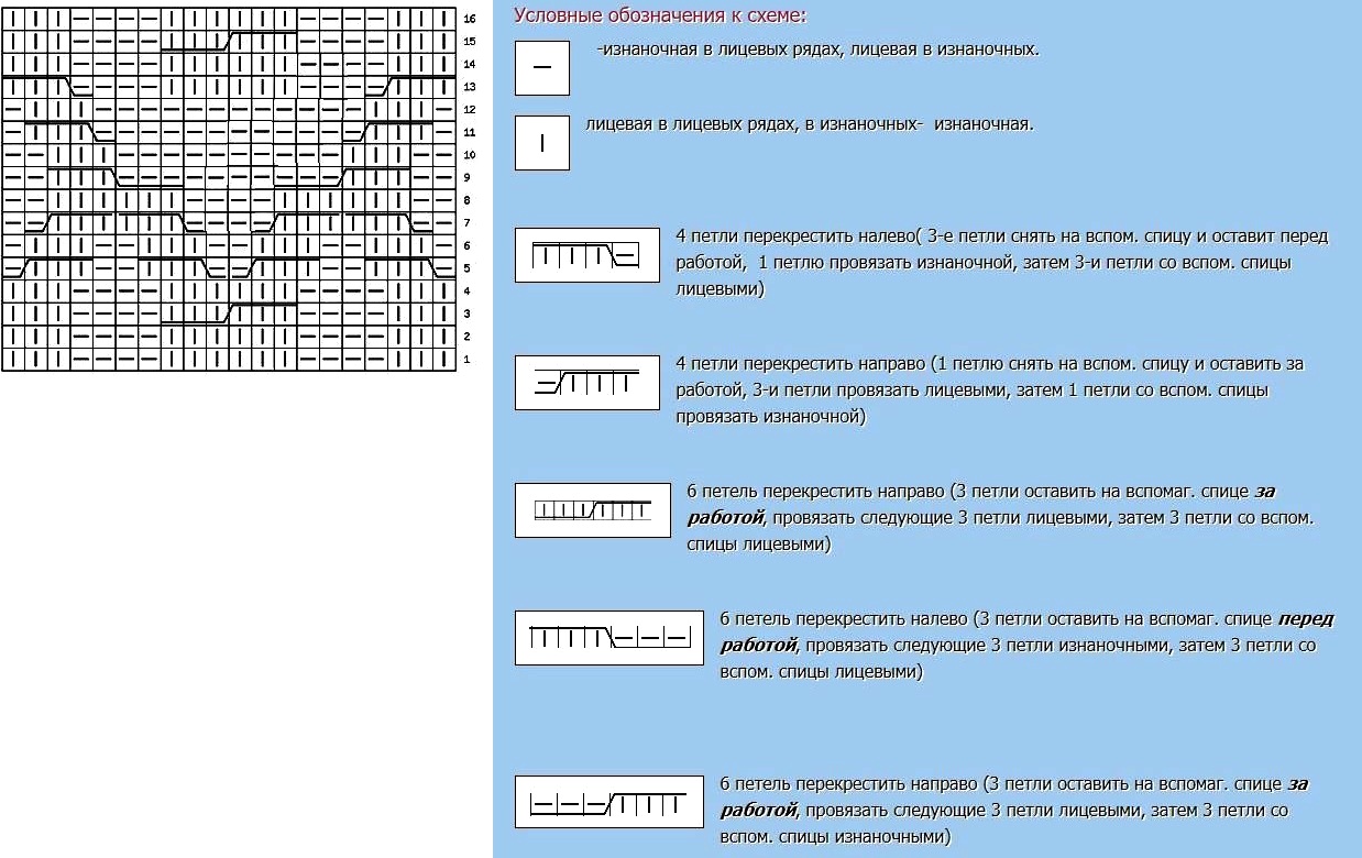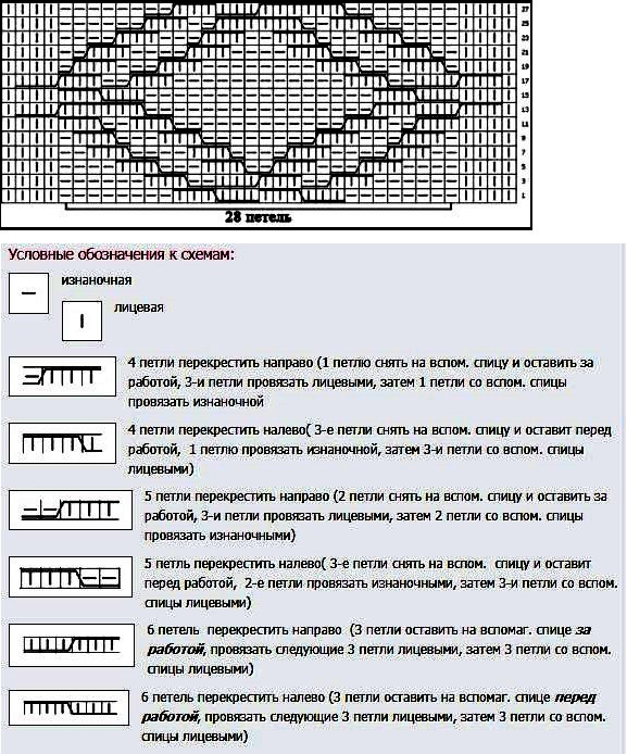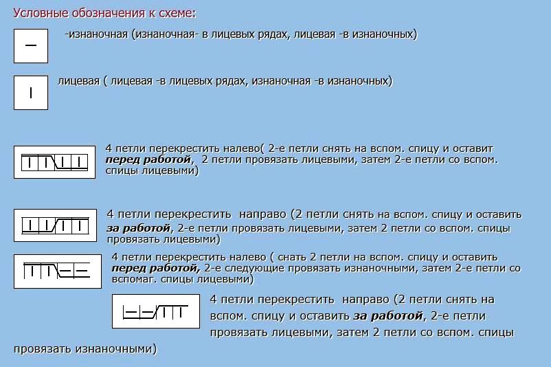 Вязание таких узоров спицами можно выполнять по схеме, внимательно чередуя петли.