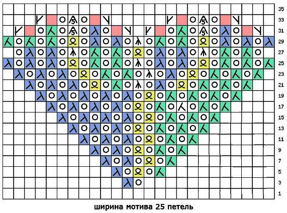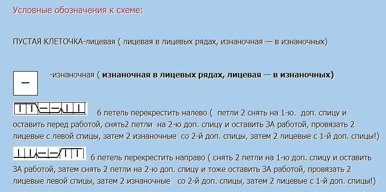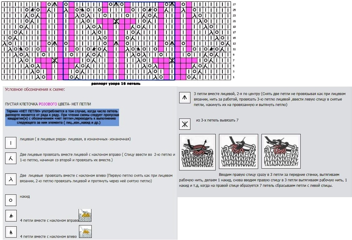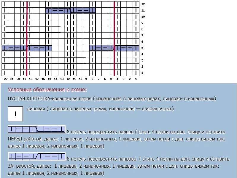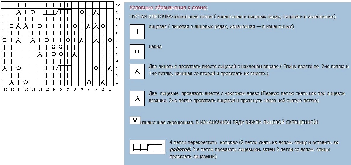 Исходное кол-во птл набираем кратным 4 + 2п. Высотный Р = 4р. Вязание узора спицами выполняем, ознакомившись с описанием и схемой.