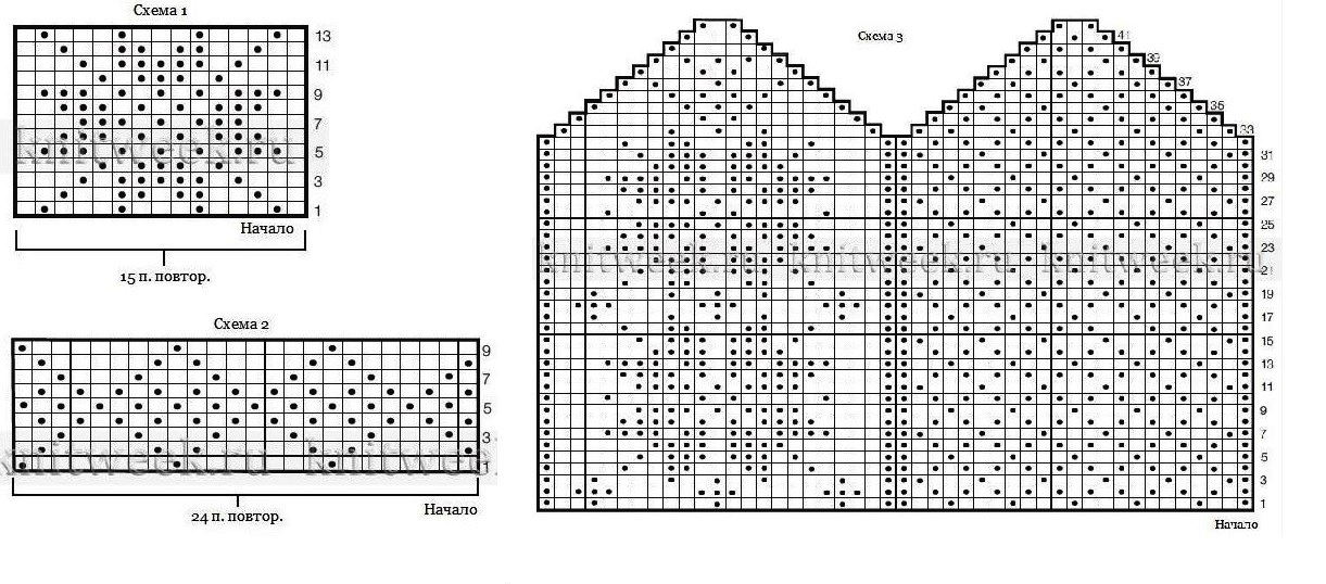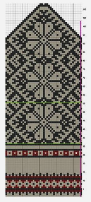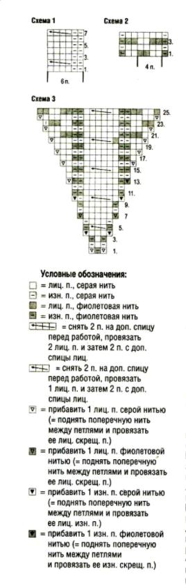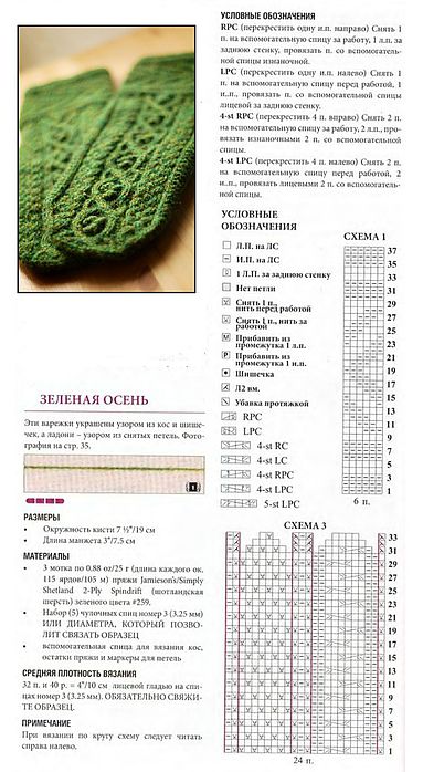 Манжетные косы вывязываем по сх. 1, большой палец – по сх. 2, основной узор – по сх. 3.