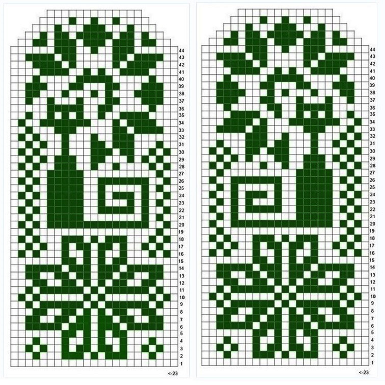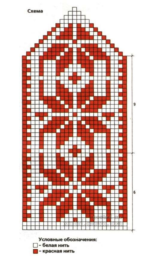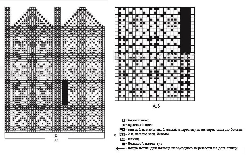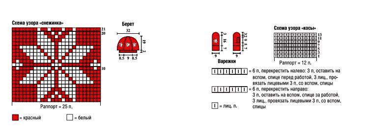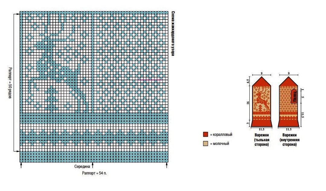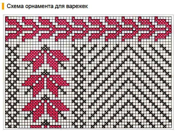 Схема вязания правой варежки спицами с таким узором полностью аналогичная, но выполняется зеркально.