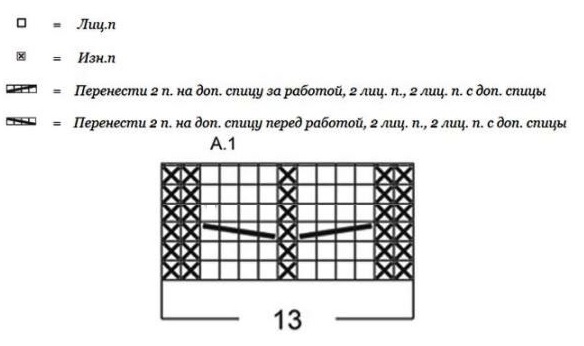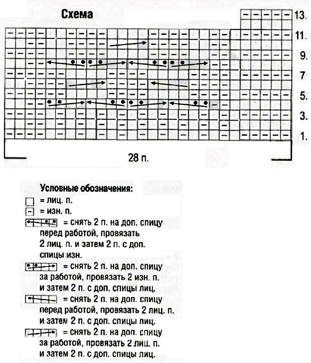 - 12р.: 14л., из 1п. →2л., 10л., 4и., снимаем 2п. на вспом. сп. за работой, 2л., 2л. со вспом. сп., снимаем 2п. на вспом. сп. перед работой, 2л., 2л. со вспом. сп., 4и. (42п.).