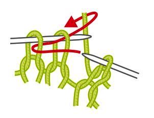 Заводим спицу в эти п. с правой стороны на левую, перекручивая их.