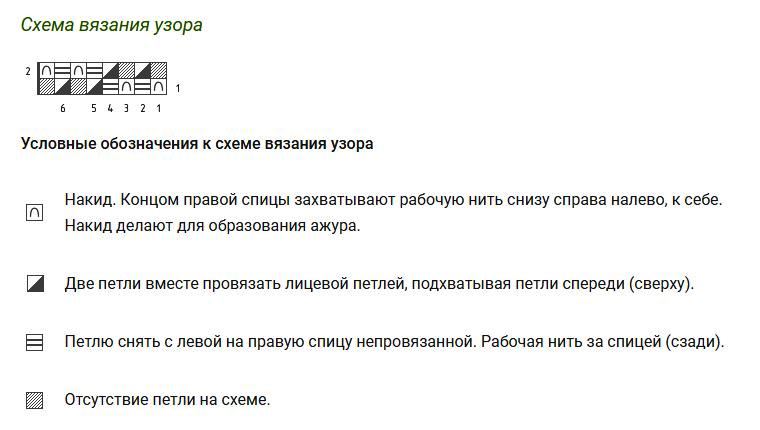 - 1р.: *1 н., 1 п. снять, 1 н., 1 п. снять, 2 п. в 1 л. п. (см. рисунок ниже), 2 п. в 1 л. п.*;