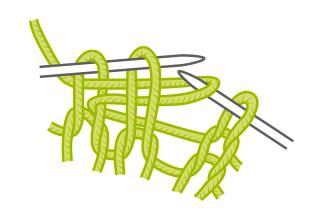 - 1р.: *1 и/пт, 3 п. снимаем без провязки, нить перед полотном*, 1 и/пт;
