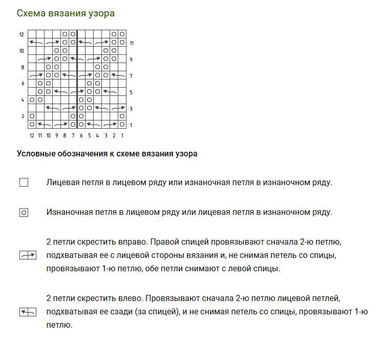 - 1р., 7р., 13р., 19р: *2 из/пт, 2 л/пет, перекрест из 4 л/пт направо, перекрест из 4 л/пт налево, 3 из/пт, 2 л/пт, 2 из/пт;