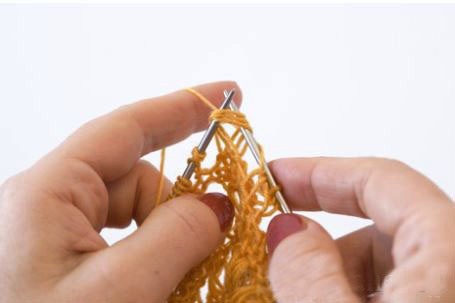 - 1р.: *из 2 п. связать 2 п. (= 2 п. провязываем в 1 и., потом, не спуская их с левой сп., провязываем их в 1 л.)*;