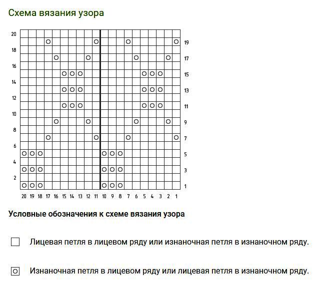 Р по ширине – 22 пет., по высоте – 40 р. Вязание выполняем по схеме и описанию, представленным ниже. На сх. изображены только лиц/р., в изн/р вяжем все петельки по рисунку, кроме обозначенных черными кружками.