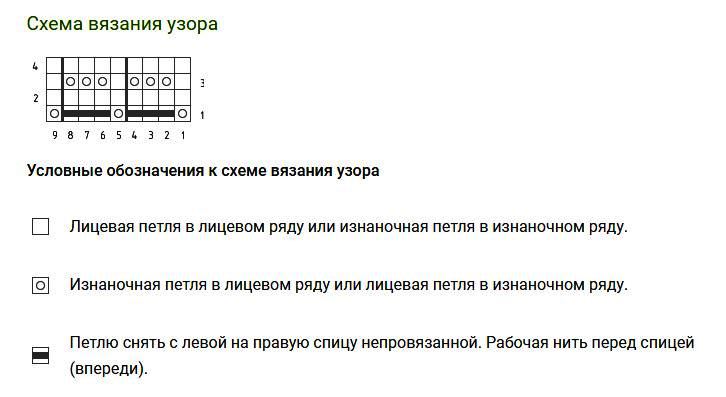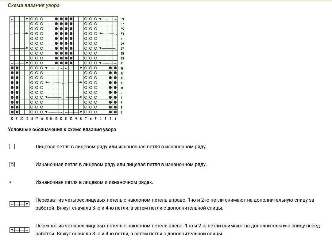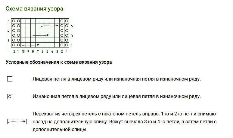 - 1р.: *2 изнан., 4 лицев., 8-ая и 9-ая петли снимаются на вспом. спицу за полотном, 2 лицев., 2 лицев. со вспомог. сп.*, 2 изнан.;