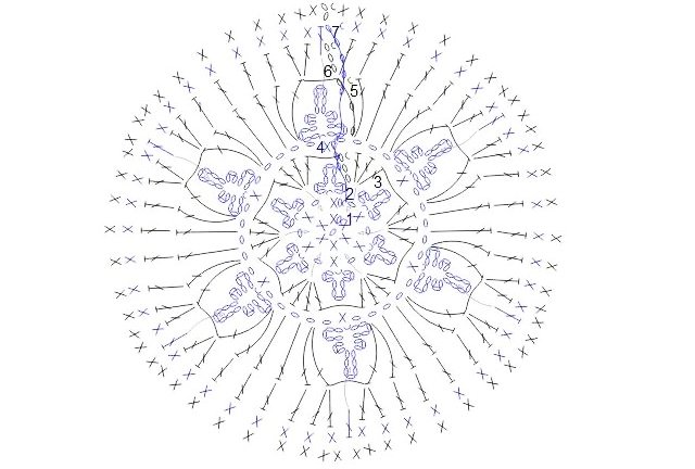 Начало вязки нового рядка также сдвигаем на 1 петельку, выполняя сс. по ряду. В этом рядочке вязание расширяется из-за увеличения числа с. с н. по лопастям. Продолжаем вязание по схеме до нужного размера.