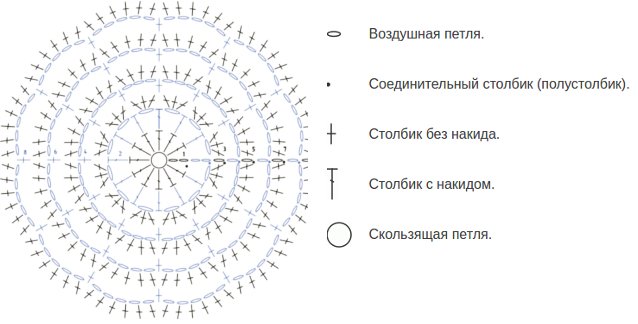 Вначале набираем крючком 12 в. п. и соединяем их в колечко с помощью соединительной петельки. Далее придерживаемся предложенной ниже схемы.