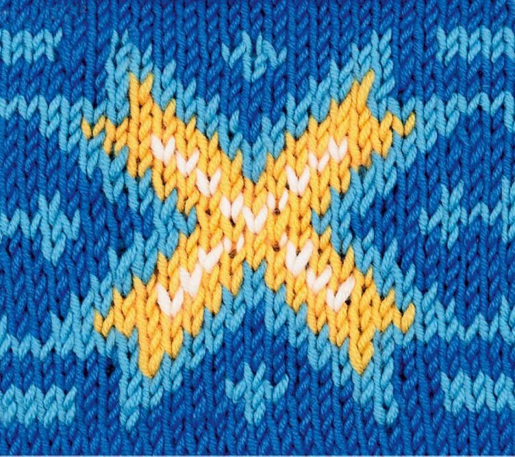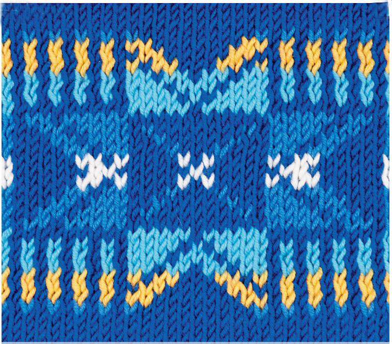 Подбираем пряжу двух цветов. Она должна быть хорошей выделки и ни в коем случае не линять. Набираем 25 птл + 23 птл + 2 кром. Вяжем изнан. п. синей пряжей. Последнюю петельку р. провязываем обеими нитками. Так будем поступать во всех остальных рядах, обеспечивая равномерное натяжение нитей по краям полотна. Кроме этого, провязывание последней кромочной птл двумя нитками исключает необходимость вертикальных протяжек. Далее выполняем вязание спицами узора, поочередно задействуя нити.