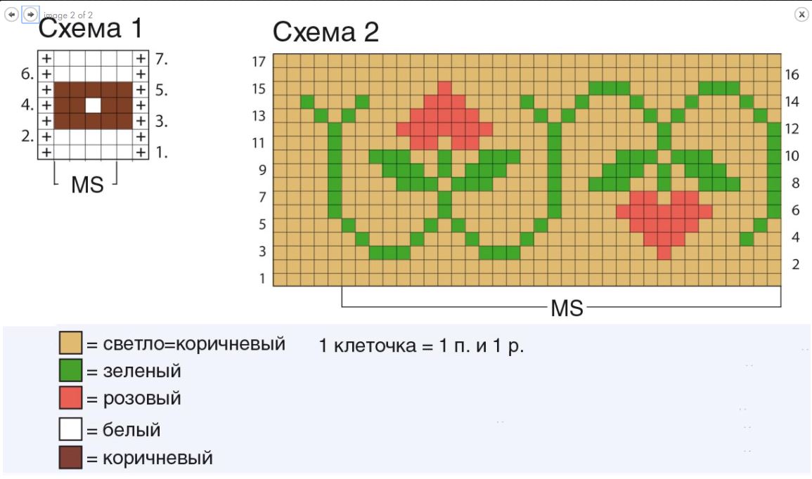Нерабочая нить свободно протягивается по изнаночн. стороне. Провязываем однократно с 1-го р. по 7-ой р. сх. 1, затем с 1-го р. по 17-ый р. сх. 2, в завершение – с 1-го р. по 7-ой р. сх. 1.