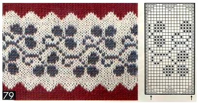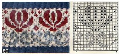 Вязать жаккардовые узоры такого типа совсем просто – не нужно чередовать разные цвета пряжи в ряду. Смена пряжи делается через два или четыре рядка. Рисунки узора получаются за счет снятия определенных петель схемы непровязанными. В след-щих рядках они вяжутся нитью другого цвета.