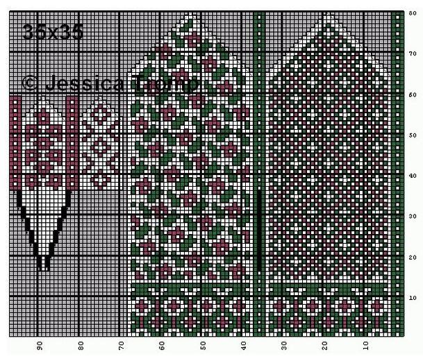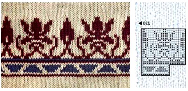 В рисунке много мелких деталей, используется несколько цветов пряжи. Этим обусловлена его сложность для неопытных вязальщиц.