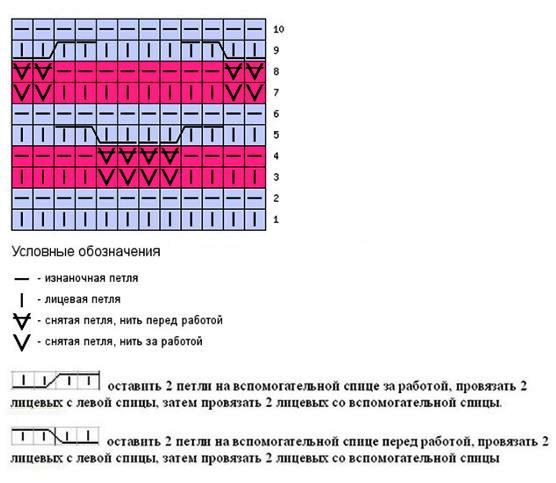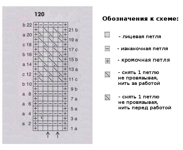 Как вязать спицами узор – см. схему. На ней изображены лиц. и изнаночн. р.
