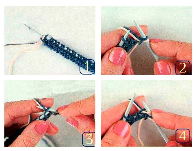 Переходим на синюю пряжу. Эта нить находится дальше от рабочей спицы, чем желтая. Проводим спицу под желтой нитью правее, захватываем синюю пряжу и провязываем ее. Опять подтягиваем нити.