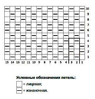 На ней петельки показаны так, как они выглядят с лицевой стороны полотна. Для прямых/обратных рядков узорчик выполняем по алгоритму: