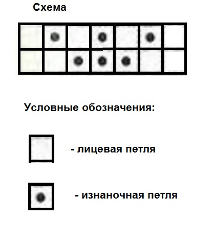 - 2р.: над изнаночными вяжем лицевые п., над лицевыми – изнаночные: *1 лиц./п., 1 изн/п.* – от * и до * повторяем на всех петельках;
