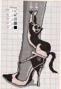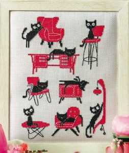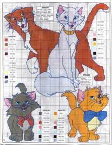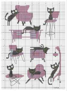 Также используют схемы монохрома, в которых используют больше двух цветов, например черный и розовый, или желтый и зеленый. Рисунок, который будет представлен ниже, выполнен двумя оттенками мулине на белой канве. Он изображает забавных кошек, которые занимаются разными делами.