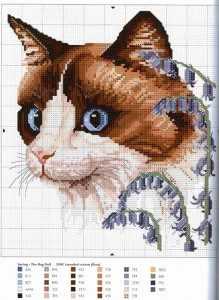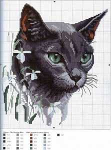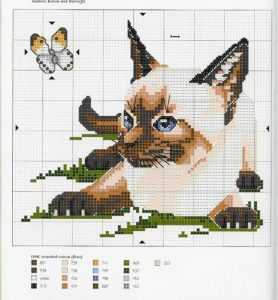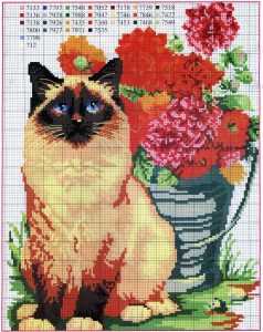 А эта сиамская кошка сидящая возле цветов, обязательно станет вашей любимицей. Вышивка довольно сложная, так как в ней задействовано большое число разных оттенков мулине. Тем не менее работа заслуживает отдельного внимания, так как сиамскими животными можно только восхищаться. Если у вас не все сразу будет получаться, попробуйте это делать частями, через небольшие промежутки времени. В любом случае, стоит завершить вышивку такого красивого животного в технике креста.