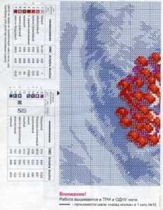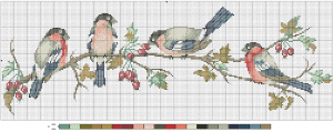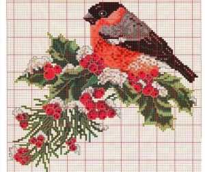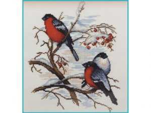 Еще одна схема изображает этих пышногрудых птиц сидящих на рябиновой ветке, припорошенной снегом. Белый фон картины делает этих птиц более заметными. Эта вышивка в технике креста также не из легких, потому что в ней задействовано больше семнадцати оттенков мулине. Новички также могут попытаться оформить такое изделие. Если не получится, всегда можно подобрать для себя более подходящий вариант.