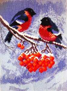 Процесс вышивки снегирей крестом