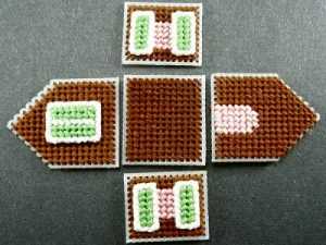 Возьмите переднюю и заднюю стенку и два оттенка ниток. Например, это может быть коричневый цвет для основы и розовый для двери конструкции. На задней стене нужно будет оставить пустое пространство, так как позже на нем следует создать объем. После этого переходим к боковинам. Они будут идентичны друг другу, то есть вышивка будет одинаковой. По центру снова оставьте два пустующих места, так как потом в них будут клеиться отдельно вышитые элементы.