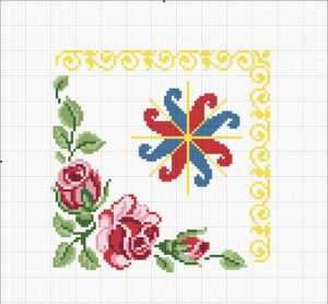 Ладинец можно вышивать не просто обычным знаком, но и добавить для красоты обрамление из цветов или фигурной рамки, как это можно увидеть на другой представленной схеме.