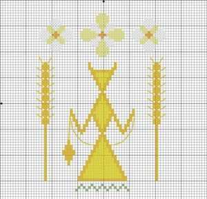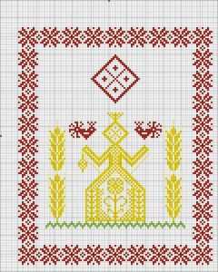 Следующая схема изображает древнюю богиню Макошь. Она является родоначальницей всех древне – славянских богов. Макошь всегда была покровительницей домашнего хозяйства, которым занимались не только женщины, но и мужчины, а также рукоделия. Такой оберег способен принести его владельцу в дом радость и благополучие. Подарит здоровье всей семье. Еще говорят, что этот знак может наделить человека интуитивными силами и даром предвидения будущего. Не нужно при себе носить такую вышивку крестиком, достаточно расположить ее в своем доме, чтобы сила распространялась на всех членов семьи.