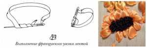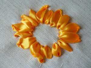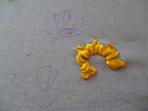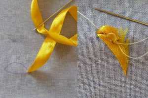 Набросав эскиз на чехол подушки, приступайте к вышивке лентами самого цветка подсолнуха. Для этого нам понадобится желтая ленточка. Закрепите ее с изнанки полотна, сделав плоский узел. Нужно загнуть кончик ленты на несколько мл., проколоть иголкой по центру, а потом ее же протянуть сквозь эту образовавшуюся петельку. Немного потяните основной материал. В итоге у вас получится плоский квадрат. Для новичков хотим сделать подсказку: таким узелком закрепляют любую вышивку атласными лентами.