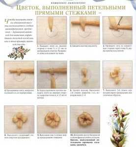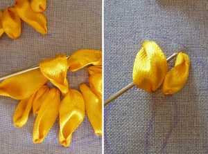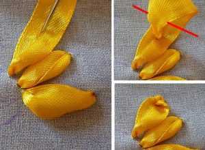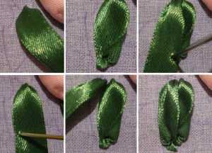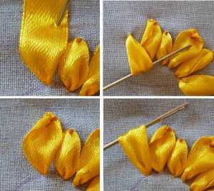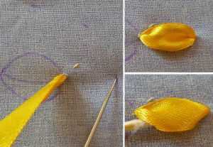 После этого выведите иголку на лиц. сторону и отмерьте длину лепесточка, сверившись со схемой. Далее вколите иголку практически возле вершины лепесточка и выведите фурнитуру на изнанку, не затягивая сильно ленту и следя за тем, чтобы она не перекрутилась. У вас должна образоваться воздушная петлица закругленной формы. Этот процесс можно наглядно посмотреть по фото.