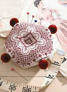 Во время того, когда наш стежок, доходит к углу, угол начального куска ткани, становится напротив сердцевины другого отреза ткани. Нет необходимости, выворачивать все на изнанку, так как шов делается на лицевой части, не смотря на то, по какой схеме он сделан. Не дошивая до конца, наполните внутренность подушки чем-нибудь мягким. После таких действий, следует просунуть через центр бискорню, иголку с ниткой. Пришейте одинаковые пуговки в центральной части, с обеих сторон. Наш мастер-класс и вышивка, закончены, а изумительная подушечка бискорню полностью готова.