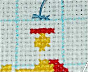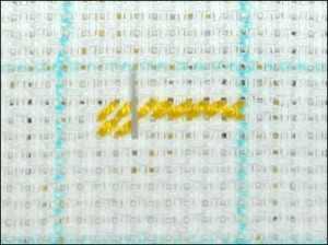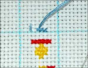 Закончив работу с соской, переходим к важному моменту – созданию одиночных крестиков. Заправляем в игу одну нить и прячем кончики. По схеме делаем два стежка и перекрываем их, после чего вновь два, но уже под верхними и закрываем. Данное действие повторяем по количеству нитей сложения – в данном варианте их три.