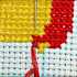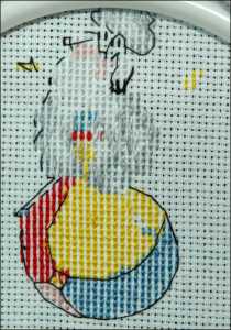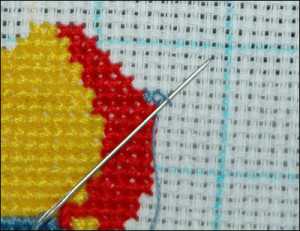 Существует еще метод, при котором получается идеальная изнанка. При этом излишние крестики закрываются сразу. Для начала формируют полукрестики в обратном от остальных направлении и разом закрывают их, протаскивая иглу под ними. Практически этом прием показан на примере данной вышивки овцы крестом. Это будет добавление красного цвета на мячике: