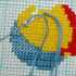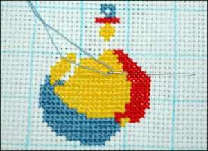 После того, как соска закончена, переходим вновь к мячу, закрывать крестики и продолжаем вышивку по схеме: