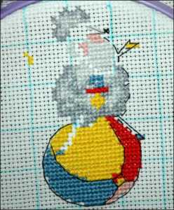 Наша овца, сидит верхом на мячике, с которого мы и начнем работу. Выводим иголку с нитью желтого цвета на изнанку, чтобы ее конец очутился на лицевой стороне, как на фото и начинаем делать полукрестики:
