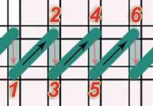 При выборе направления необходимо помнить о том, что главное добиться того, чтоб лицевая сторона полотна оставалась ровной. Чтобы двигаться диагонально, выполняя полукресты, нужно иголку вывести не прямо, а делая угол, сдвинувшись в направлении диагонально. В итоге у вас получится ровная полоса из полукрестов, которые будут направлены в одну сторону.
