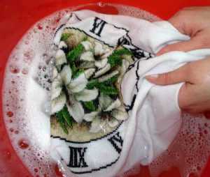Вода должна быть приблизительно комнатной температуры и ни в коем случае горячей. Так как любые нити имеют свойство линять, поэтому лучше предотвратить такое недоразумение заранее.