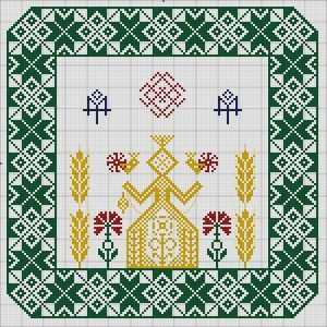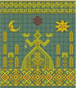 Если вдруг вам нужно прервать свое рукоделие, не стоит вставлять и оставлять канву с воткнутой в нее иголкой. В первую очередь следует оформить крупные элементы рисунка, например вышейте полностью саму богиню, начиная это делать с головы, а только потом переходите постепенно ниже, пока не оформите ее платье полностью. Только после этого приступайте к более мелким мотивам, таким, как цветочки, колоски, птицы и пчелы, которые вышивают разными цветами по отдельности.