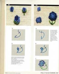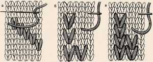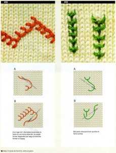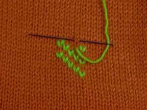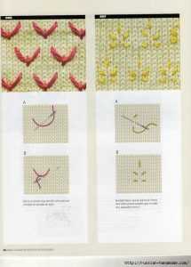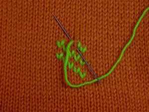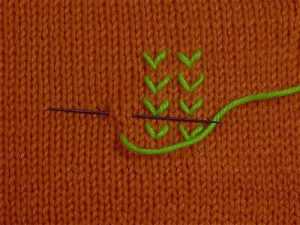 Этот необычный стежок полностью повторяет каждый контур связанной петельки. Иголку с ниткой следует вводить с изнанки, а потом выводить на лицевую сторону в точке начала петельки. Он будет проходить аналогично стороне петлицы, а потом уходить на изнанку. На переднюю часть полотна следует выводить нитку на другой половинке лиц. петлицы. В итоге у вас получится узор, который будет чем-то напоминать жаккардовый орнамент, связанный полностью.