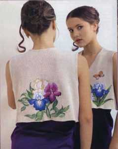 Учитывайте тот момент, что данная ткань имеет хорошее растяжение, а узор нет. Поэтому не используйте слишком большие рисунки для этого, достаточно им выделить немного места на спинке, полочке или на кармане. Вот несколько примеров схем, по которым можно вышить такие прекрасные и яркие цветочки.
