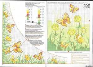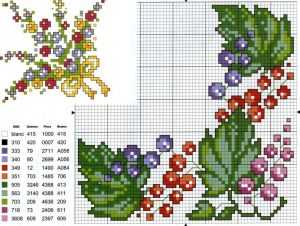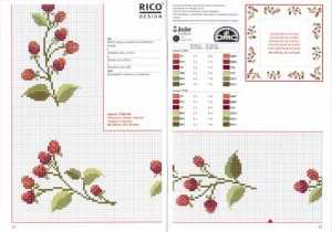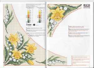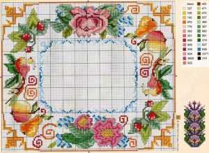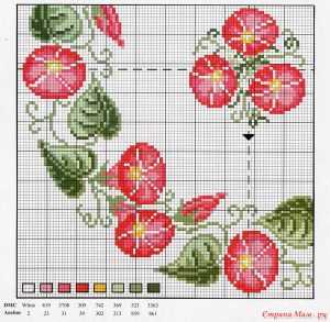 Рисунок с изображением яркого цветка, летящей птицы или виноградной грозди можно вышивать по всему периметру материи. Но это будет сложно сделать новичкам, так как необходимо рассчитывать численность фрагментов и размещать их на одинаковом расстоянии. Если вы новичок в вышивке, лучше возьмите простую схему с незатейливым узором, что бы в ней присутствовало не больше пяти цветов мулине.