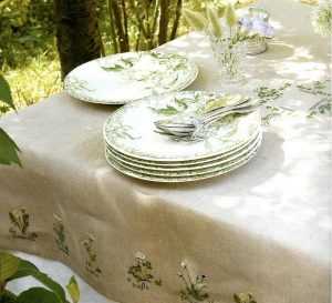 Льняная ткань считается самой подходящей для вышивки в технике креста. Поэтому, вы можете использовать в работе готовую скатерть из льна, для того чтобы вышить на ней красивый и неповторимый узор. Также вам понадобятся нити мулине различных цветов, согласно ключа схемы, иголка и пяльцы.